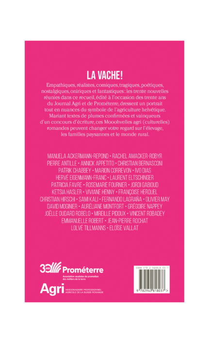 Pour fêter leurs 30 ans, le Journal Agri et Prométerre, la chambre d’agriculture vaudoise, ont lancé un concours d’écriture intitulé LA VACHE ! Ouvert à toutes les plumes romandes de plus de seize ans, il a été immortalisé dans un livre de poche éponyme.